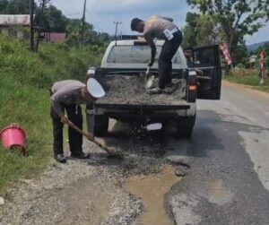 LUWU TIMUR, Kutipnusantara.com – Satuan Lalulintas (Satlantas) Polres Luwu Timur menunjukkan kepedulian nyata terhadap keselamatan pengguna jalan dengan turun langsung memperbaiki jalan rusak dan berlubang di poros Trans Sulawesi, tepatnya di Desa Ussu, Kecamatan Malili, Kamis 15 mei 2025.