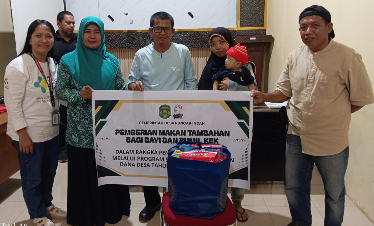 Hal itu diwujudkan melalui kegiatan penyerahan Pemberian Makanan Tambahan (PMT) yang menyasar balita stunting dan ibu hamil dengan kondisi Kekurangan Energi Kronis (KEK), bertempat di Aula Kantor Desa Puncak Indah, Jumat 29 Agustus 2025.