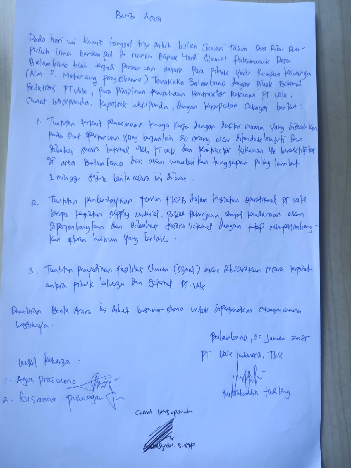 “Tindakan ini adalah bentuk intimidasi yang bisa berdampak buruk. Jika PT Vale Indonesia Tbk terus menekan masyarakat, aktivitas mereka sendiri akan terhambat di masa depan,” tegas Jois.