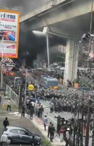 Asap tebal mengepul dari ban-ban yang terbakar, menandai puncak ketegangan yang mengganggu lalu lintas di sekitar kawasan tersebut.