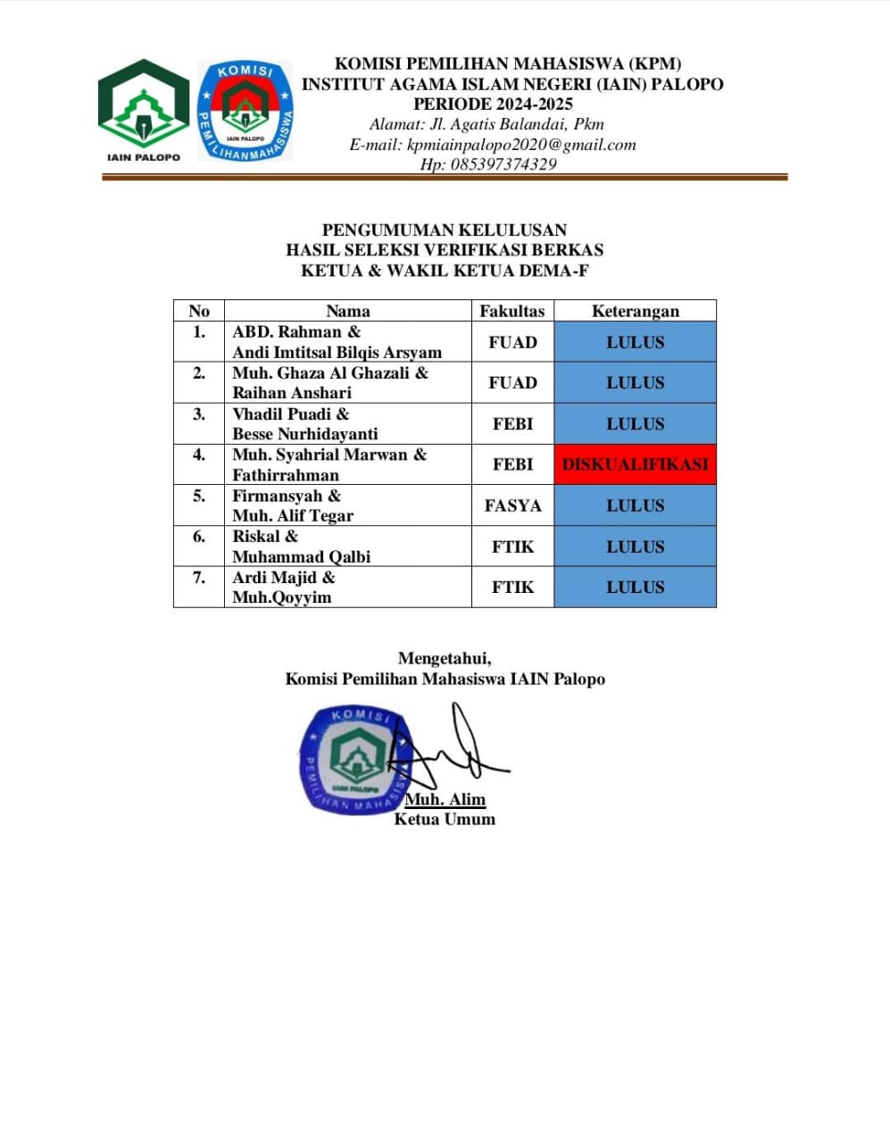 Muh. Fadly  menyimpulkan, bahwa Komisi Pemilihan Mahasiswa (KPM) IAIN PALOPO tidak netral dalam menangani perselisihan pemilma tersebut.