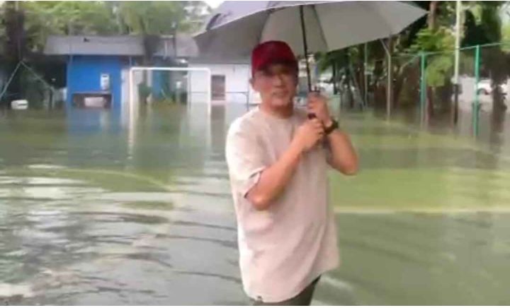 Ia terlihat berkeliling rujab dengan menggunakan payung, memeriksa kondisi lapangan yang berubah menjadi genangan air akibat curah hujan yang tinggi.