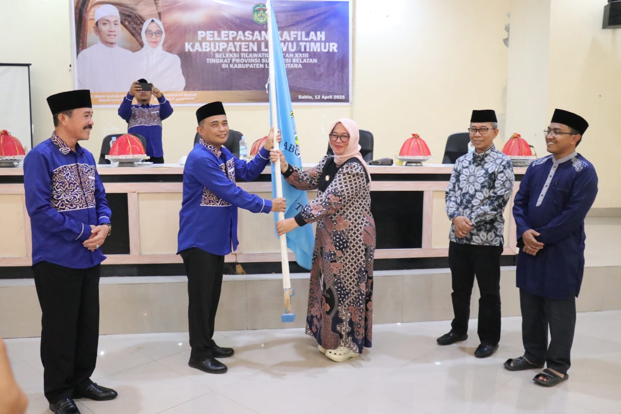 Pelepasan Kafilah Kabupaten Luwu Timur ditandai dengan penyerahan Bendera Pataka yang diserahkan oleh Wakil Bupati Luwu Timur kepada Ketua Kafilah, Masdin. (rhj/ikp-humas/kominfo-sp)