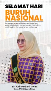 LUWU TIMUR, Kutipnusantara.com – Ketua Tim Penggerak PKK Kabupaten Luwu Timur, dr. Ani Nurbani Irwan, menyampaikan ucapan selamat kepada seluruh pekerja dalam
